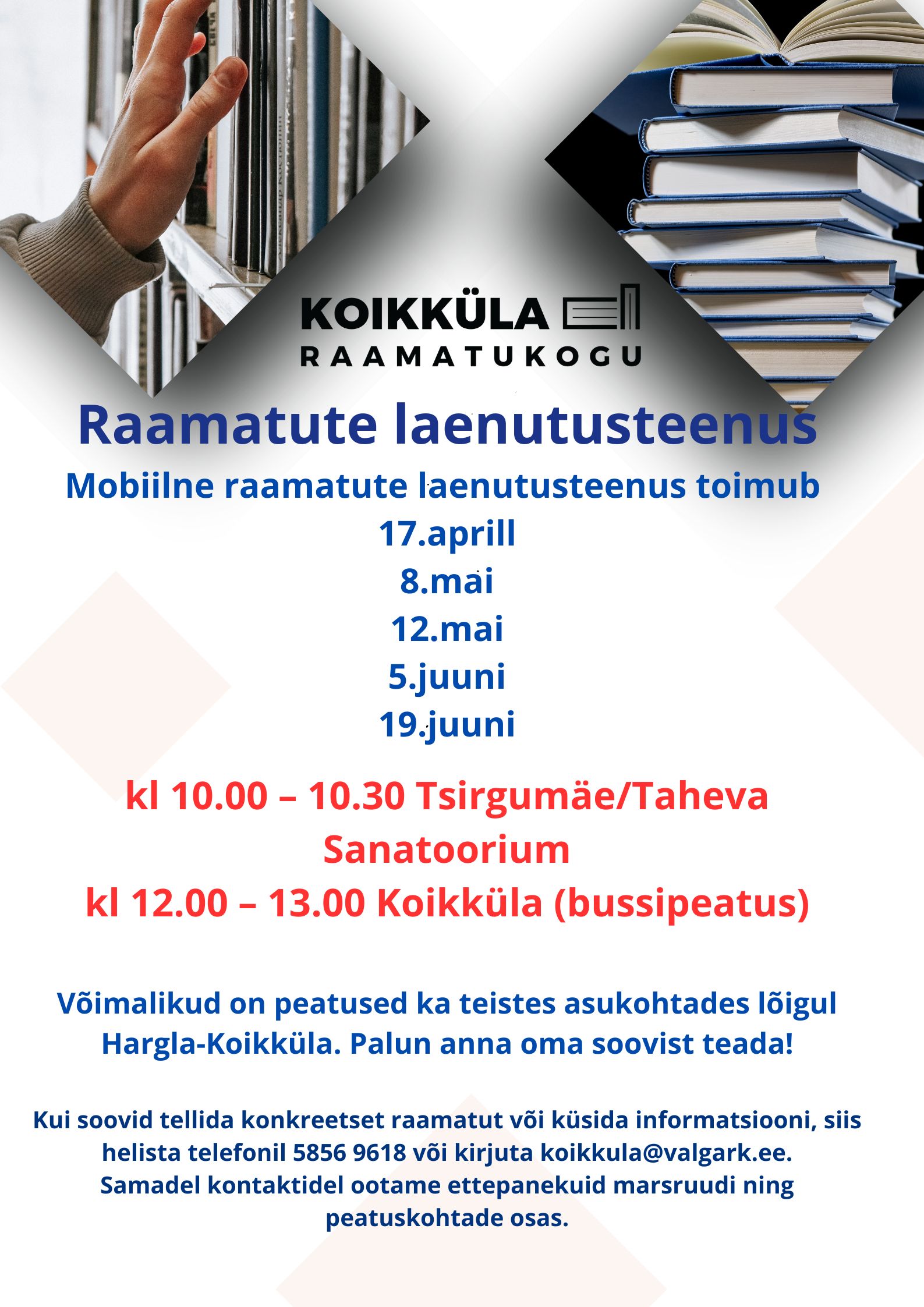 Mobiilne laenutamine toimub 17.04; 8.05; 22.05; 5.06 ja 19.06 kl 10.00-10.30 Tsirgumäe/Taheva sanatoorium ja kl 12.00-13.00 Koikküla bussipeatus