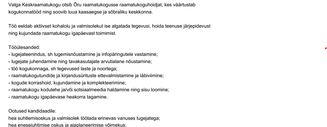Valga Keskraamatukogu pakub tööd Õru haruraamatukogu juhatajale (ajutiselt eemaloleva töötaja asendajana).