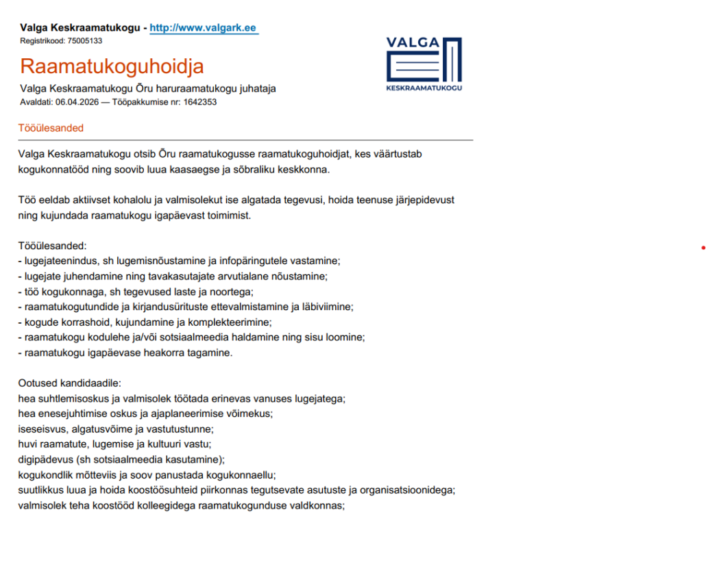 Valga Keskraamatukogu pakub tööd Õru haruraamatukogu juhatajale (ajutiselt eemaloleva töötaja asendajana).