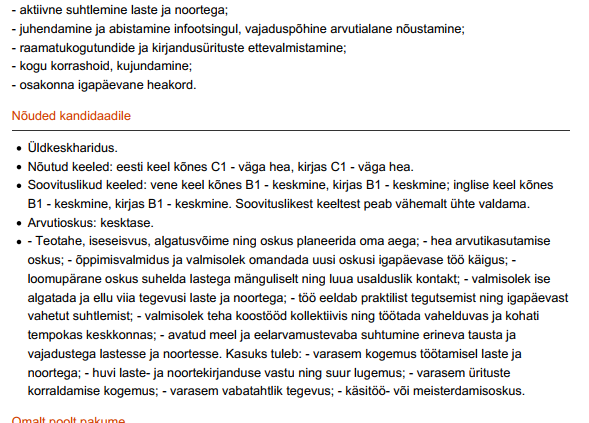 - Nõutud keeled: eesti keel kõnes C1 – väga hea, kirjas C1 – väga hea.