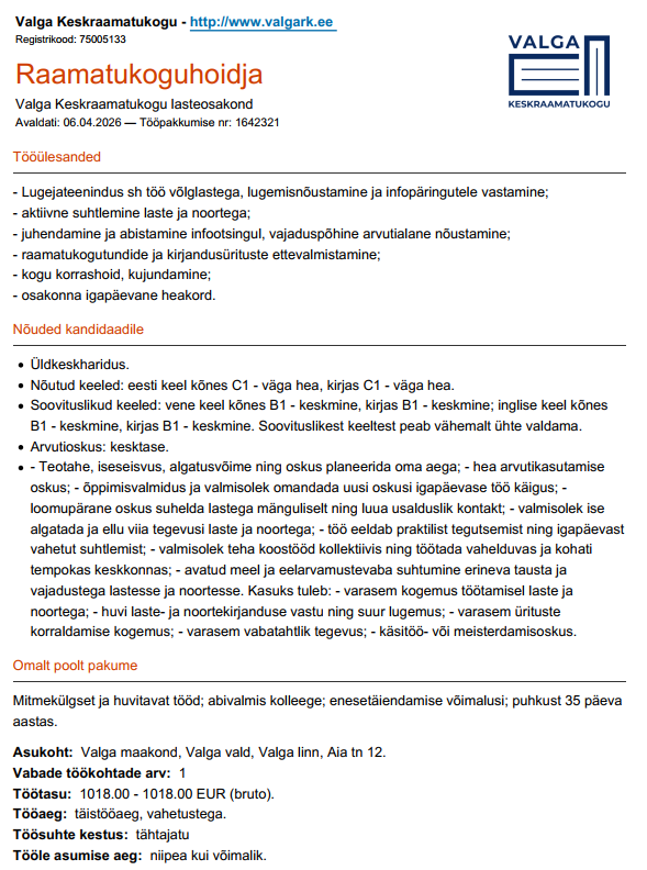Valga Keskraamatukogu pakub tööd lasteosakonna hoidjale.